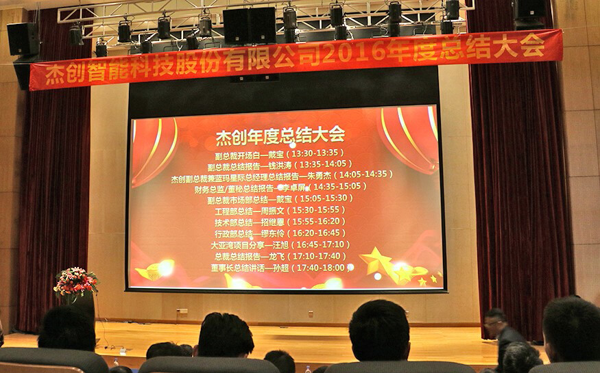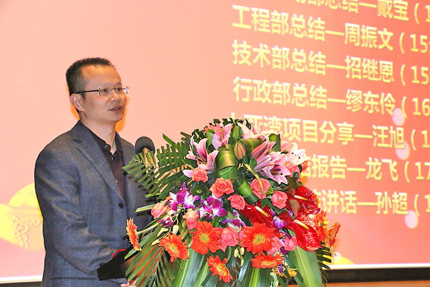 总结大会上,在公司副总裁戴宝先生激情洋溢的开场白后,副总裁钱洪涛先生、365英国上市智能董事兼蓝玛星际总经理朱勇杰先生、财务总监兼董秘李卓屏女士、副总裁戴宝先生、工程部总监周振文先生、技术部总监招继恩先生、行政部总监缪东伶女士、工程部副总监汪旭先生、总裁龙飞先生先后登台,分别做了2016年度工作总结。