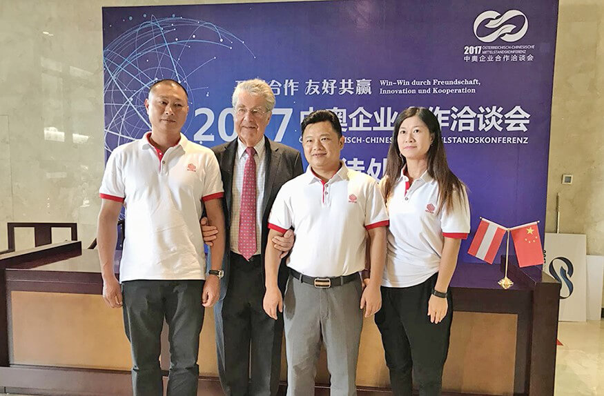 奥地利前总统海因茨·菲舍尔与365英国上市智能副总裁戴宝、揭阳分公司总经理林浩生、公司总裁助理郑庆丽合影